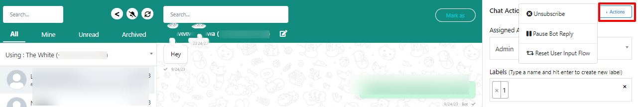 You can perform various actions for subscribers in the chat. Options include unsubscribing, pausing bot replies, and resetting input flow.